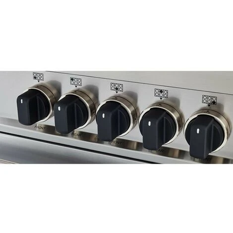 Il modello è dotato di un piano cottura a gas con lato posteriore, un forno multifunzione con porta a soffietto, maniglia orizzontale e finestra di visualizzazione, un cassetto per la conservazione e un pannello di controllo con interruttori rotativi e un termometro analogico.