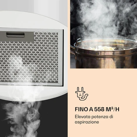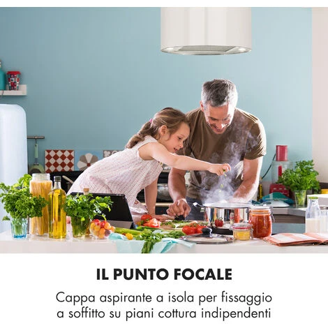 POTENTE E SMART: Con 3 livelli di potenza e un flusso di 558 m³/h, la nostra cappa cucina a isola sospesa riduce gli odori e filtra i fumi migliorando la qualità dell’aria. Il timer di spegnimento automatico spegne la cappa quando non la utilizzi.