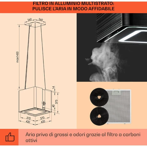 In sospensione: cappa aspirante a isola con installazione a soffitto e potenza motore di 200 watt