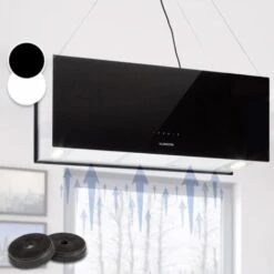 Anche l’aspetto con design Pure Ambience della cappa a isola Kronleuchter XL di Klarstein è elegantissimo: fronte e retro sono in vetro di sicurezza nero, mentre i lati in acciaio inox spazzolato.