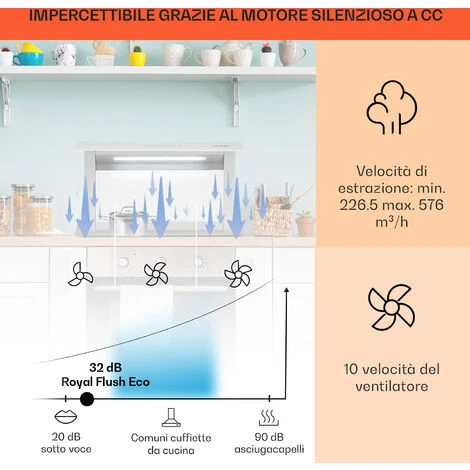VENTOLA SILENZIOSA: Grazie alla potente portata d’aria di 576 m³/h e 10 velocità, la nostra cappa aspirante 60cm non solo filtra i fumi e riduce gli odori, ma lo fa in modo silenzioso così da permetterti di cucinare e conversare senza interruzioni.