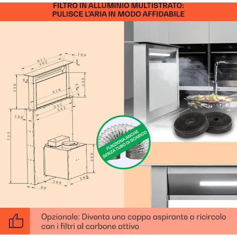MODALITÀ DI SCARICO E RICIRCOLO: Oltre alla funzione di ventola di scarico, funge anche da cappa da cucina a ricircolo. Quando si passa alla modalità di ricircolo, i filtri a carboni attivi venduti separatamente, intrappolano abilmente odori e fumi.
