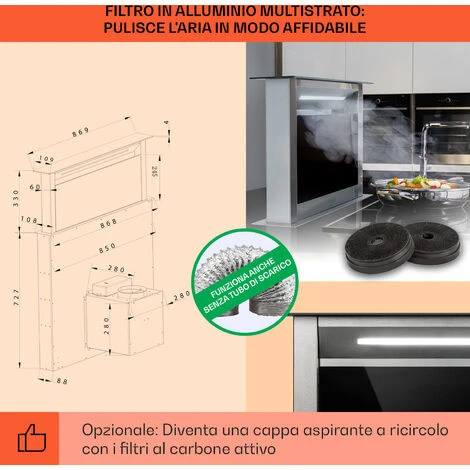 MODALITÀ DI SCARICO E RICIRCOLO: Oltre alla funzione di ventola di scarico, funge anche da cappa da cucina a ricircolo. Quando si passa alla modalità di ricircolo, i filtri a carboni attivi venduti separatamente, intrappolano abilmente odori e fumi.