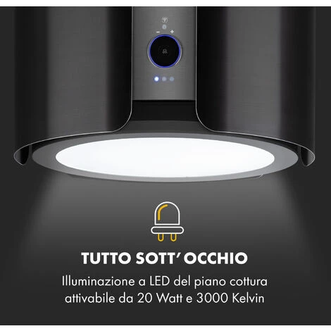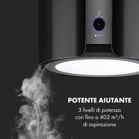 Con tre livelli di potenza e una portata d’aria fino a 402 m³/ora, fa circolare il vapore senza sosta liberando così l’aria della tua cucina da grasso e odori. Un’illuminazione integrata del piano cottura a LED assicura un’ottima luce mentre si cucina, mentre la manopola touch frontale illuminata con display digitale serve per selezionare facilmente uno dei tre livelli di potenza. Inoltre, è possibile azionare la cappa aspirante a isola tramite l’app Klarstein o il controllo gestuale.