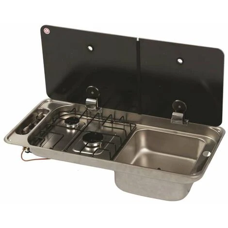 Piano di cottura a 2 fuochi con lavello in Acciaio Inox e elegante coperchio in Vetro nero temperato diviso tra zona cottura e lavello. Completo di termocoppie e accensione piezoelettrica.