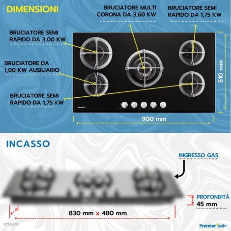 PremierTech PC5G90V è un piano cottura a gas da 90 centimetri, provvisto di cinque zone di cottura con bruciatore doppia corona e contraddistinto da un design raffinato. Grazie a questo elettrodomestico efficiente, sicuro e funzionale, sarà possibile arredare la propria cucina con stile, nonché preparare cibi e pietanze gustose con risultati impeccabili.